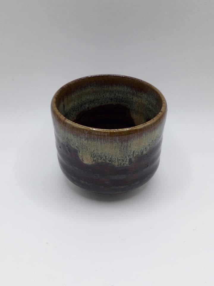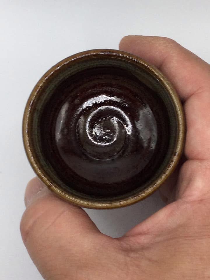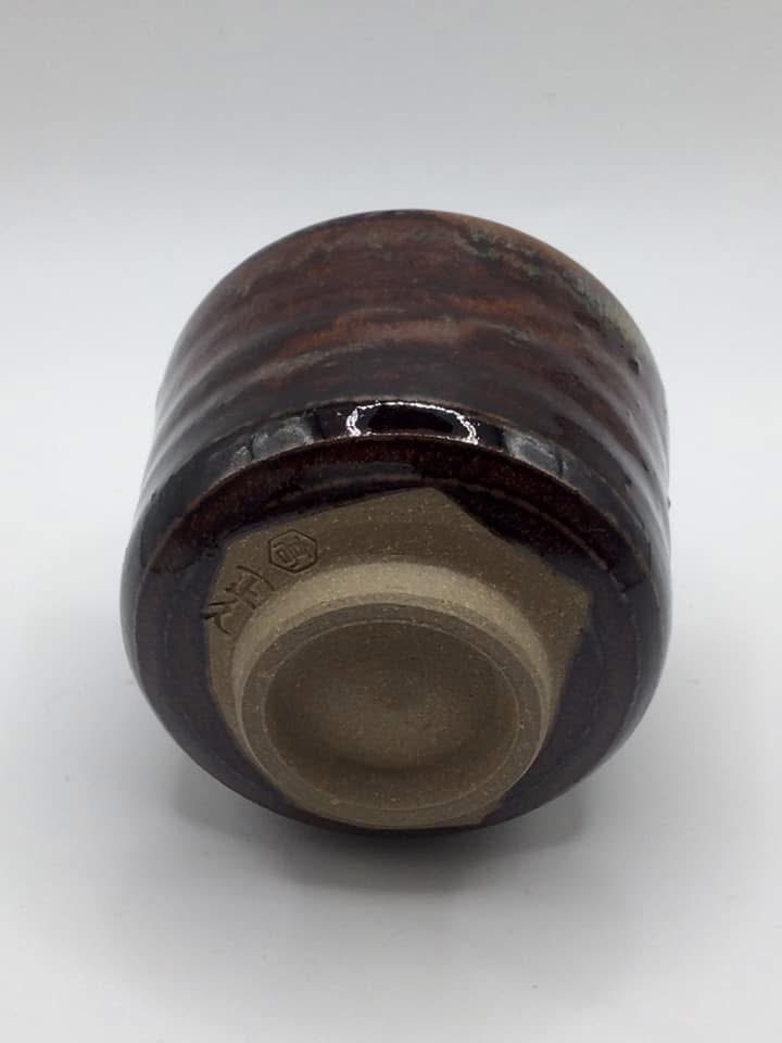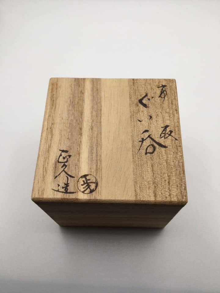 後日、高取焼に興味を持った私は福岡市北西部、早良区に高取焼窯元の存在を知って早速出かけました。こちらは「小石原高取」に対して、「東山高取」(※2)と呼ばれています。地下鉄空港線藤崎駅から徒歩数分、小高い丘の住宅街を登って行くと瀟洒な「高取焼味楽窯」を見つけました。広い敷地内には現代的な2階建ての「味楽窯美術館」と和風建築が配され、先づは美術館を訪れました。立派な展示室には先代十四代亀井味楽作の遠州高取の茶陶が並び、綺麗さびの名品を堪能。1階のギャラリーショップで亀井正久氏(現十五代亀井味楽氏)のぐい呑みを購入して家路につきました。ぐい呑みは30年前ですから正久氏30代初めの作です。古高取に挑戦され、十五代を襲名されるなど、今も新たな領域に挑戦し続けておられるとの事、