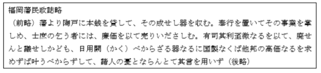 「藩から陶器を営むところにお金を貸して、出来た器を納めさせてる、奉行をおいてその事業を統制しているが、庶民のなかには安く売っている。その利益は僅かであるので、やめたいと言っているが、日用品として欠くことができない器であるがゆえに我が国で造らなければ、よその国のものを高く求めなければならない。よって人々の憂いとなってはいるが、それは聞き入れられない。」となっています。