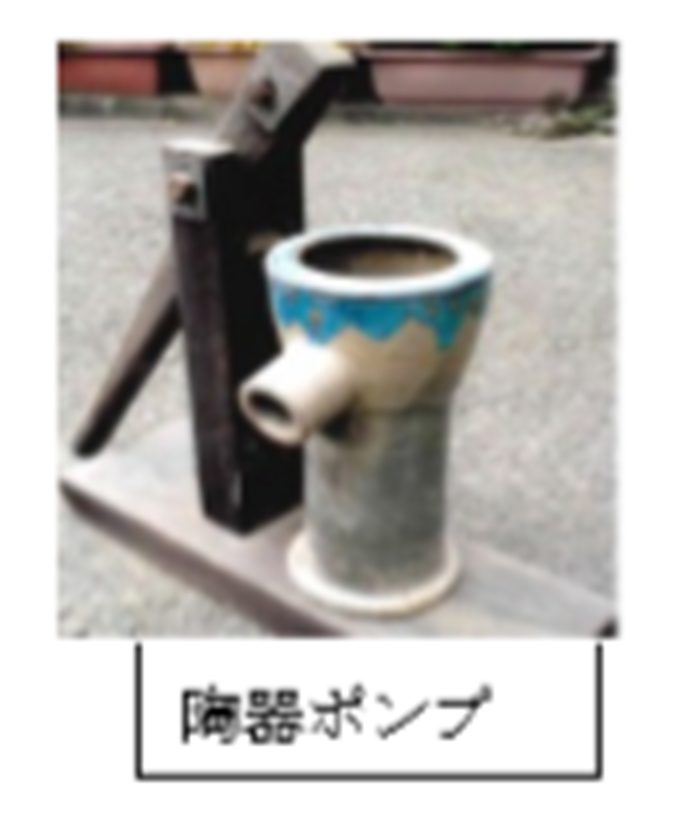 井戸は、当初はつるべ井戸でしたが、木製ポンプに代わり、次いで陶器ポンプにかわりました。狂いがなく値段の安い陶器ポンプは、九州一円から上方まで進出しました。しかし水道が普及しポンプの時代はおわりました。