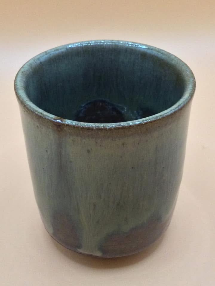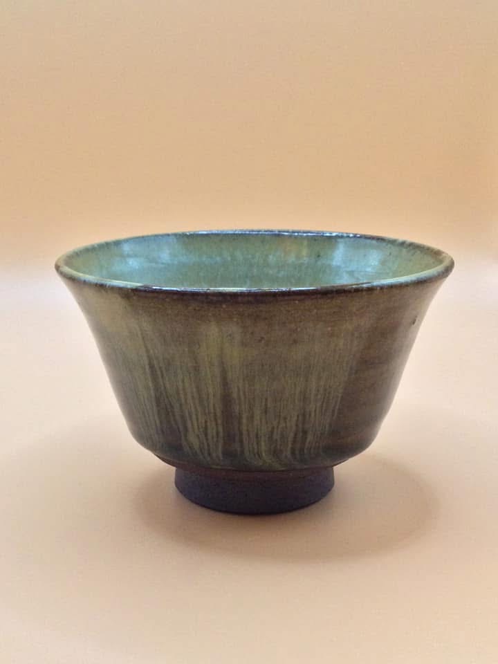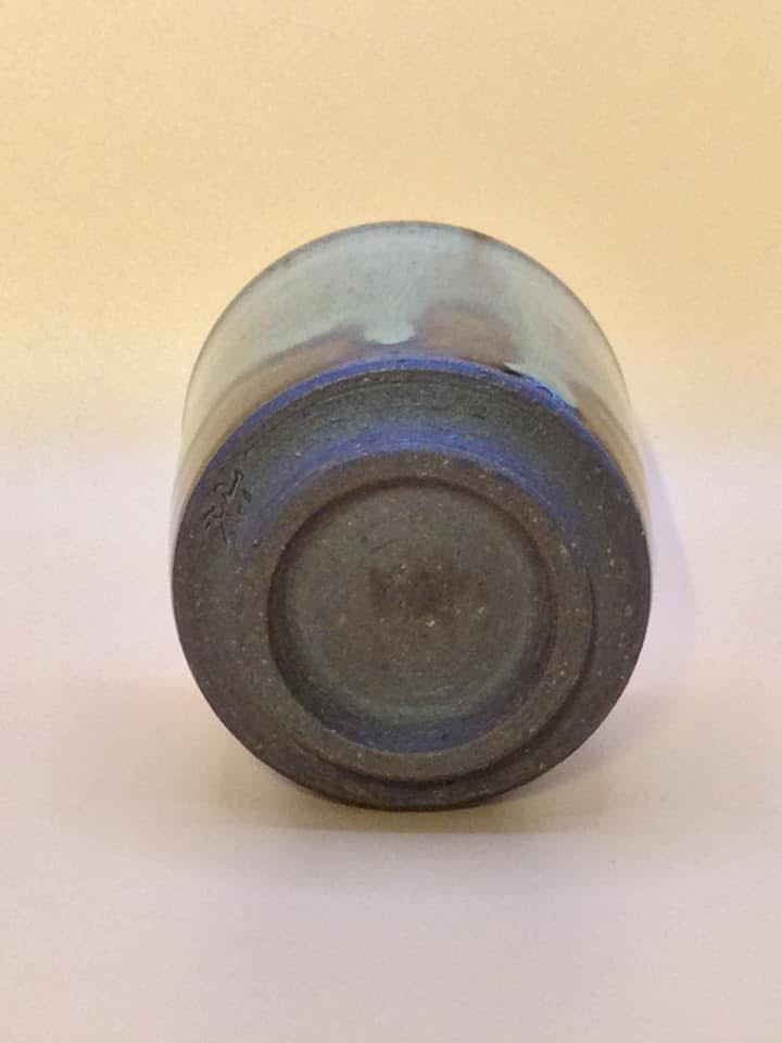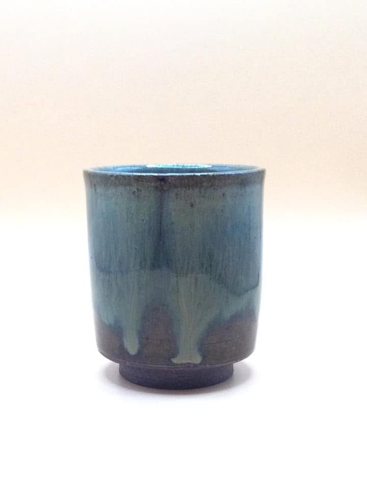 店内はまるで豪農の住まいといった趣で、心は押され気味。そこへ、いかにも肥後女性といった飾らぬ快活なおばあさんが先ずは一服とお茶を出してくださいました。出された湯呑にお茶が綺麗に映え、古民家の静寂の中ですっかり緊張はほぐれていました。小代焼というやきものを初めて知った瞬間でした。茶湯と雑器があり、どれも茶褐色の地色に青、黄、白の釉薬(*2)が口縁部から胴や見込みに垂れている朝鮮唐津に通ずる景色です。青小代筒型ぐい呑みと先ほどの湯呑をいただいて帰りました。偶然にも、この窯元こそが明治期に小代焼を復興された近重治太郎氏の健軍窯(たけみやかま)で、先程のおばあさんは治太郎氏の奥様だったのかもしれません。(現在は移転され健軍の南、嘉島町でご子孫が「小代焼たけみや窯」を営まれています。)