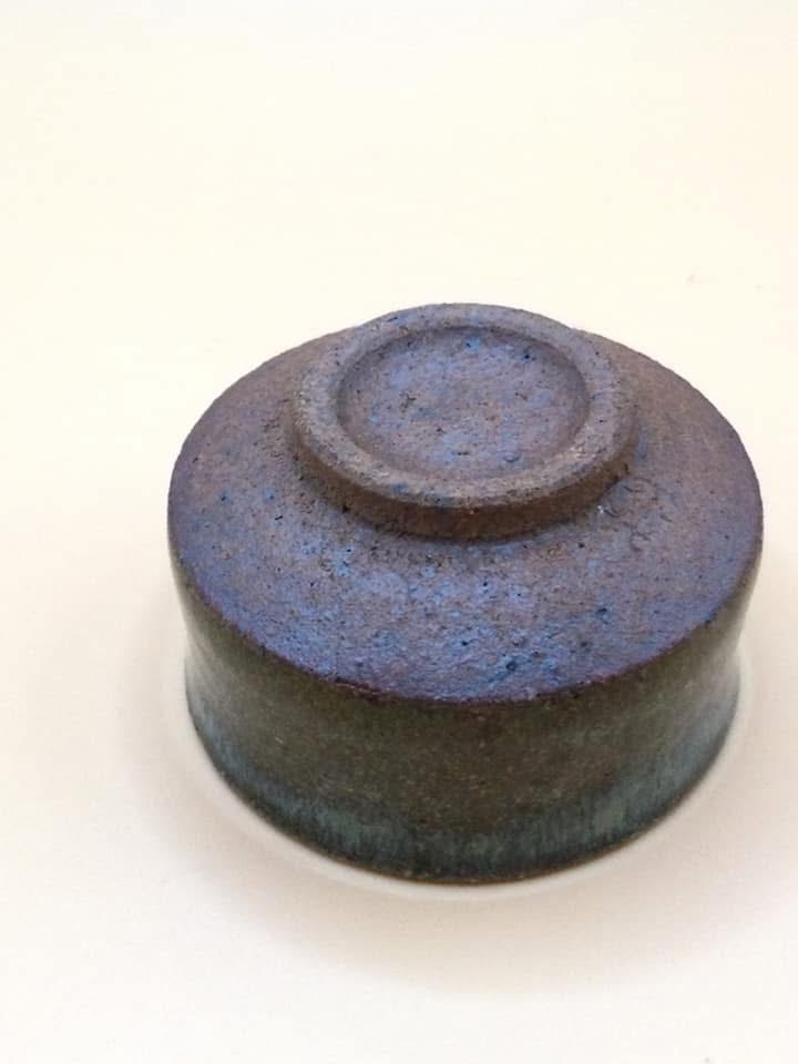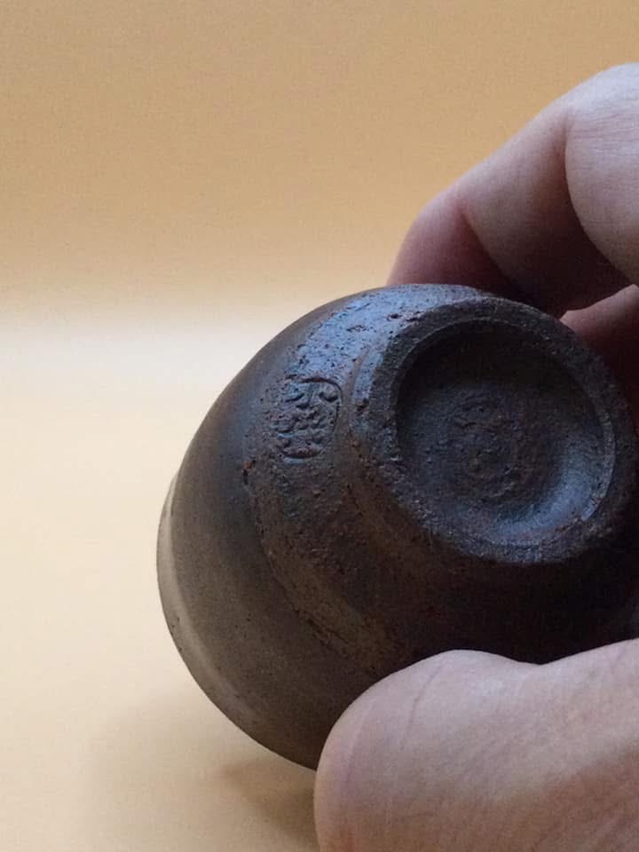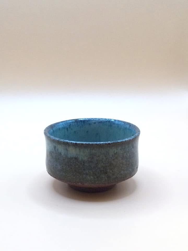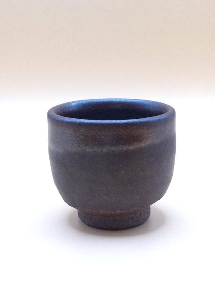 蛇足ながら、荒尾に接する福岡大牟田駅近くで出会った陶芸家のギャラリーでもとめた小杯も画像に添えておきます。九州男子の面白い方で、褐色釉はご当地三池炭鉱のボタを混ぜたものとのこと、一方の青小代は、造り、釉調も小代焼らしくしっかりしています。