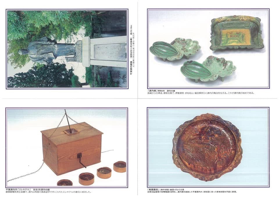志度の「平賀源内先生遺品館」に伺いました。瀬戸内の穏やかな湾にあり、四国霊場八十六番志度寺の町です。顕彰会各位によって大事に源内遺品が保存展示されています。平賀源内は1728年(享保13)に当地で生まれた俳人・滑稽小説・浄瑠璃作家。また、医学・本草学(薬学)を修め、磁針器(外科手術器具)、量程器(万歩計)、エレキテル(起電機)、火浣布(石綿耐火布)を作成、日本初の物産博覧会を発案、紀州産物誌・物類品しつを発刊、西洋画の教授、伊豆・秩父・秋田の鉱物採掘等々、杉田玄白、司馬江漢とも親交のあった多能の天才でした。中でも、二度(1752、1770)にわたって長崎遊学し、殖産の窯業振興を説いています。1771年、天草代官に提出された「陶器工夫書」は陶法伝授書で、源内プロデュースにより、志度で焼かれたのが交趾風「源内焼」です。後にその陶法を発展させ赤松民山の「民山焼」、堀尚八の「尚八焼(なおはちやき)」、富永庸八の「庸八焼」、四代紀太理兵衛の「富田焼」へと波及していったようです。源内焼がどのような焼物であったかは画像を参照ください。