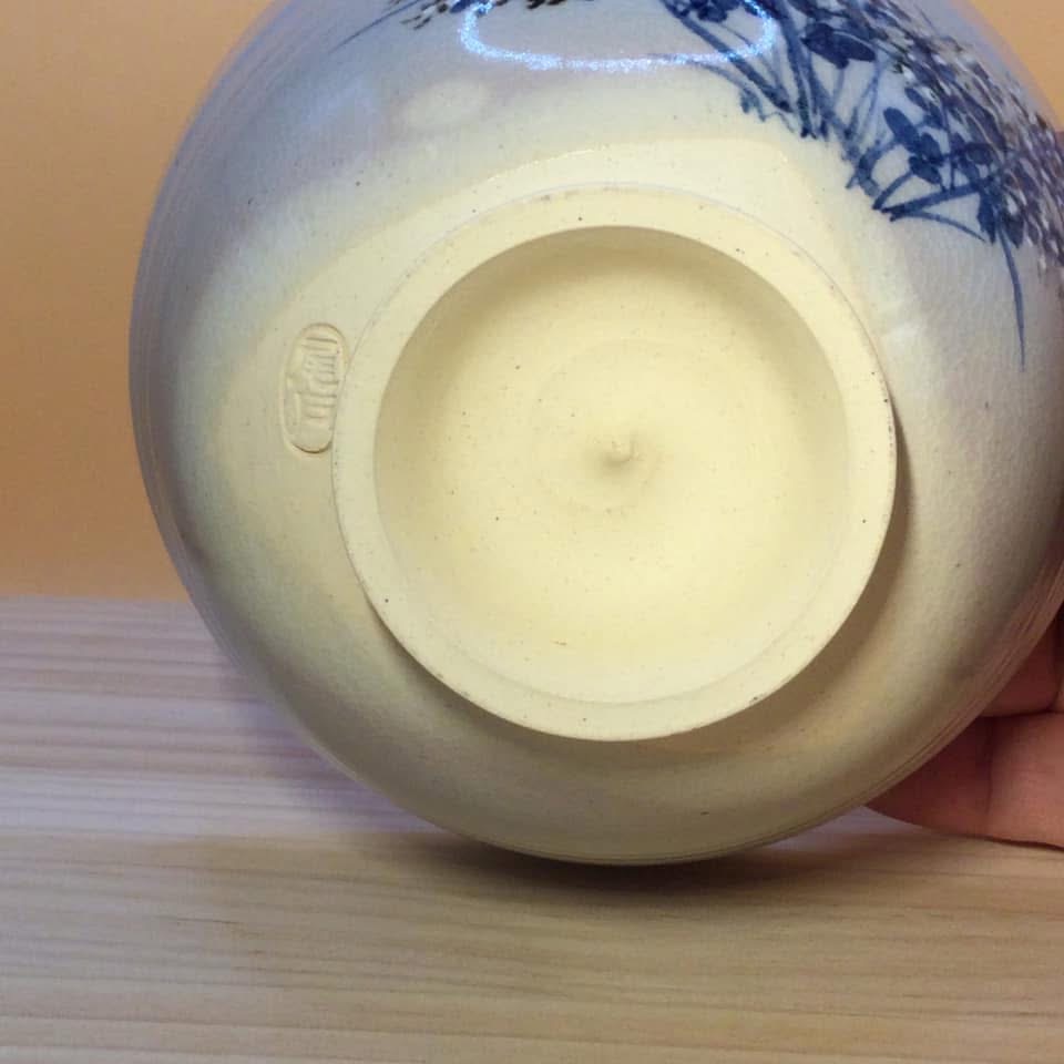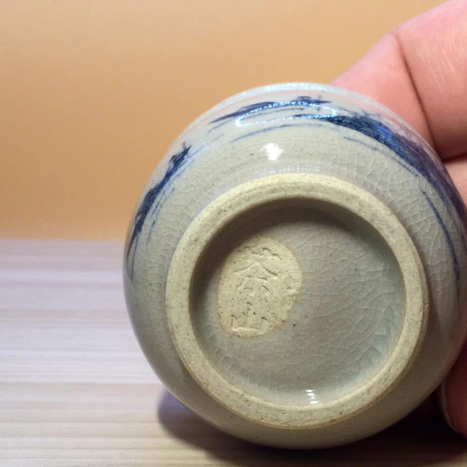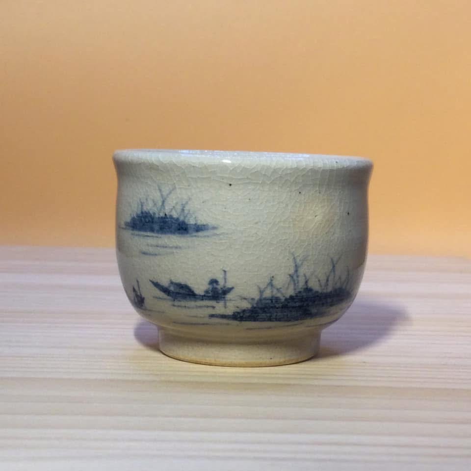 というわけで、市街地より鏡川を渡った鴨部の地、能茶山(のさやま)「尾戸焼窯元」に土居庄次氏を訪ねました(土居窯の近くにはもう一軒、明治より続く谷信一郎氏の「谷製陶所」が今に続いています[2021年時点])。土居氏は、正に“いごっそう”らしいお人柄で応対してくださいました。庄次氏曰く、弟君は絵付け上手でしたが近年先立たれ、今は庄次氏のご子息が絵付け修行中とのこと。弟君の遺作は数少なく伝統柄“松竹梅”茶碗と“秋草の絵”茶碗くらいが残るのみとのこと。現代的で爽やかな“秋草の絵茶碗”をいただいて帰ることにしました。ぐい呑みについてお尋ねすると、奥様が「もっとよいものがあったのですが、今はこれしかないので」と上手を勧められず残念そうなご様子、すぐさま“ぐい呑み”とその“誠実さ”を頂戴しました。立ち去り際に、庄次氏ご夫妻が表まで見送ってくださったこと、今も良き思い出となっています。